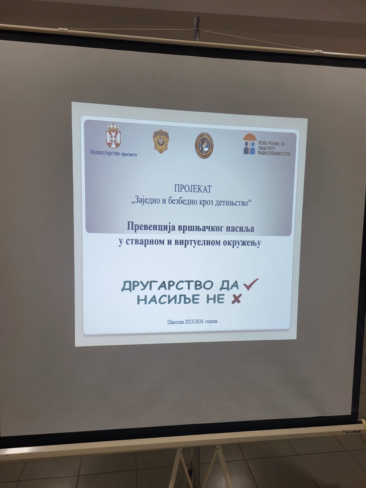 Данас је у нашој школи одржана радионица у оквиру пројекта „Заједно и безбедно кроз детињство“ који је покренуло Министарство унутрашњих послова у школској 2023/2024. години. Акценат овог пројекта стављен је на то да ученици схвате колико је безбедност важна и како треба имати поверења у нашу полицију. Представник МУП-а одржао је радионицу ученицима петог и седмог разреда. Радионица је била едукативног и забавног карактера, на њој су учествовали сви присутни ученици, постављајући полицајцу питања или одговарајући на њих. На крају радионице одржан је квиз како би се видело шта су ученици запамтили и научили током едукације. Троје најбољих је добило значке са исписаним логом пројекта.