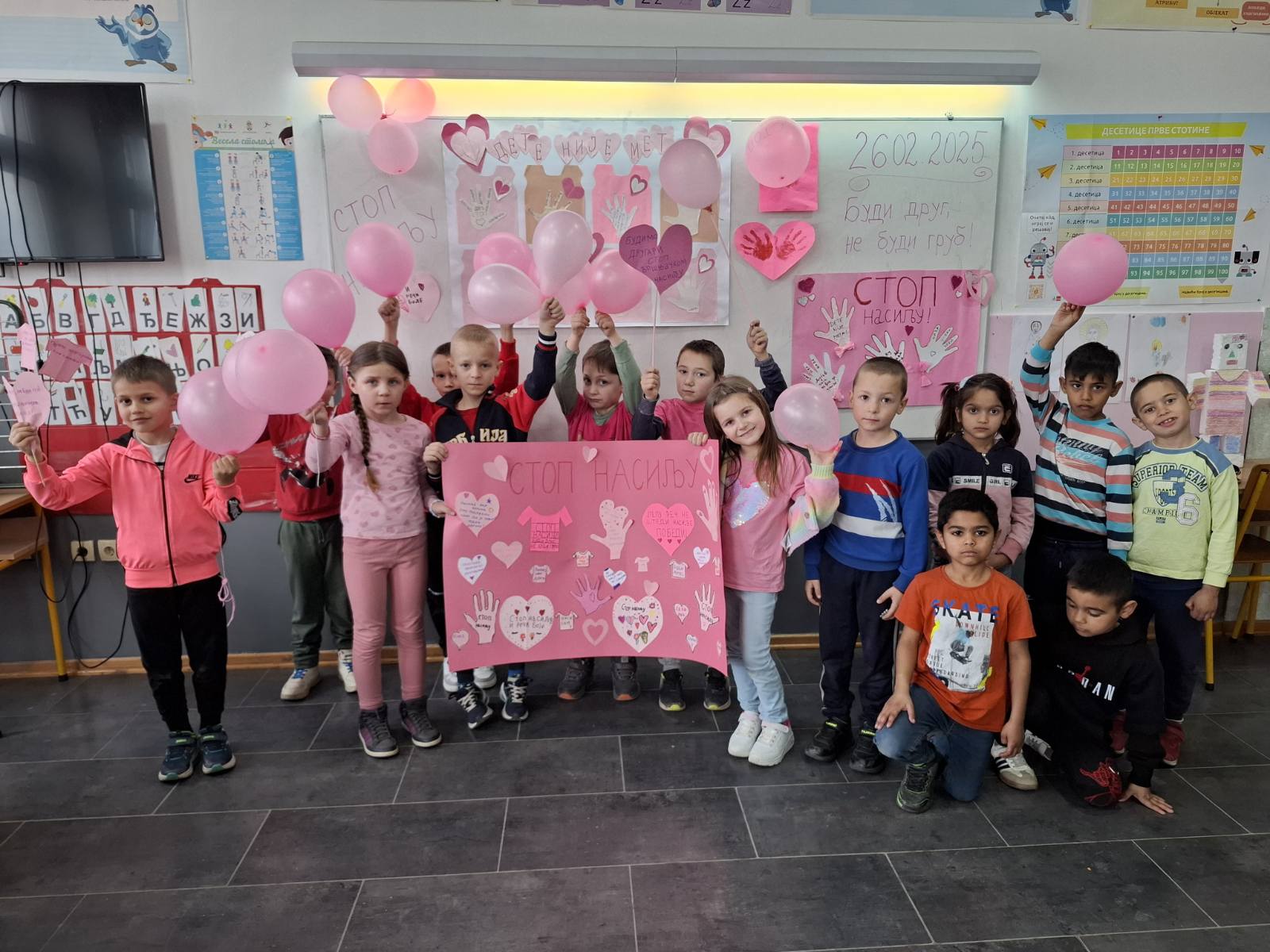Последње среде у фебруару месецу у свету се обележава Дан розе мајица који заправо представља Дан борбе против вршњачког насиља. Ученици првог разреда су са својом учитељицом Наташом Бајић Миливојевић обележили овај битан дан. Првацима је презентован кратак едукативни филм о вршњачком насиљу, а затим су одељењски писали и цртали поруке подршке које се тичу борбе против вршњачког насиља. Поруке упућују и указују на значај толеранције, заштите и поштовања права различитости, и подстичу ученике на ненасилну комуникацију и мирно решавање конфликата. Затим су ученици заједно са својом учитељицом направили пано на тему насиља и изложили га у учионици. Након спроведених активности, ученици су у дворишту школе пустили розе балоне као знак подршке борби против вршњачког насиља.