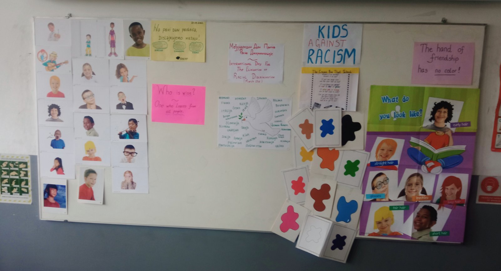 На данашњем часу енглеског језика ученици петог разреда анализирали су фотографије које говоре о различитости, дискриминацији и вредностима, као што су једнакост, солидарност, правда и поштовање. Читали су изреке на енглеском језику и преводили их на матерњи. Разговарали су о различитим земљама, а на крају је свако добио своју дугу са задатком: прва боја је боја коже, друга је боја косе, трећа очију… Када су завршили бојење дуга, ученици су схватили да ниједна није потпуно истих боја, а све су лепе на свој начин.